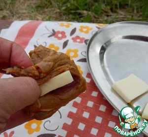 Нарезаем сыр ломтиками чуть меньше кусков мяса, толщиной около 4 мм.