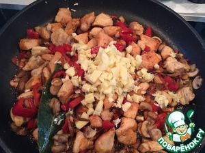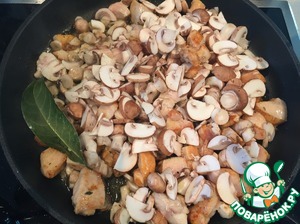 Обжарьте мелко нарезанную курочку, затем добавьте шампиньоны и снова обжарьте.