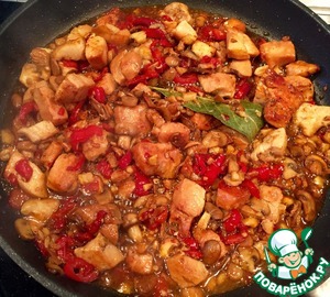 Если у вас есть куриный бульон- добавьте половник. Нет, воды. Готовьте до упаривания жидкости.
