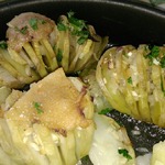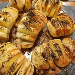 Моем картошку, делаем в ней вот такие надрезы - сперва ровно, не доходя ножом до конца, а потом насечку наискосок, чтобы срезать косой лепесток - так удобнее вкладывать сало и лук