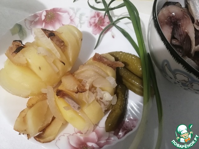 Начиняем картошку кольцами промаринованного лука и кусочками сала
