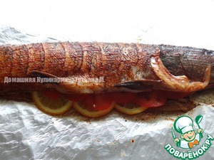 В брюхо вложить по 3 дольки апельсина и перца болгарского;