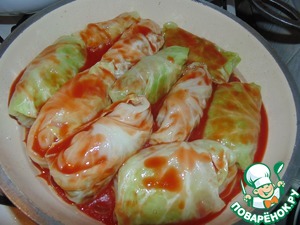 Заливаем голубцы одним стаканом томатного сока. Можно развести томатную пасту и добавить соль и сахар (должно получится не очень кисло). Тушить на медленном огне около 40 минут.