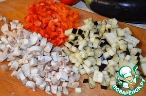 Нарезать овощи на аккуратные кубики размером с половину ногтя. Каждый овощ обжарить на сковороде отдельно очень быстро, чтобы овощи похрустывали.