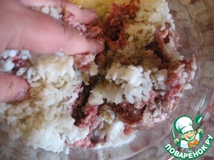 В фарш добавляем соль, перец, рис, измельченный лук и вымешиваем