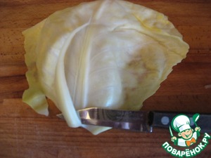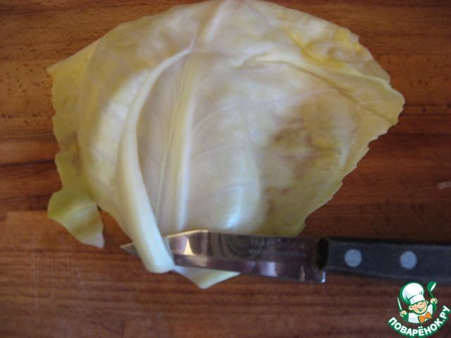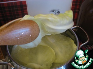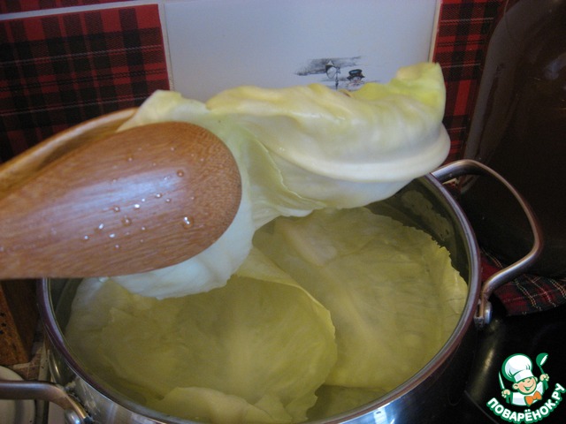 Капустные листья опускаем в кипящую воду на 1-2 минуты, вынимаем и остужаем