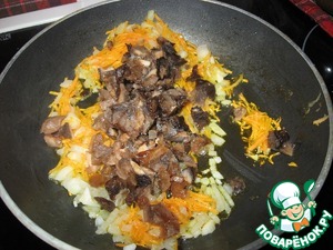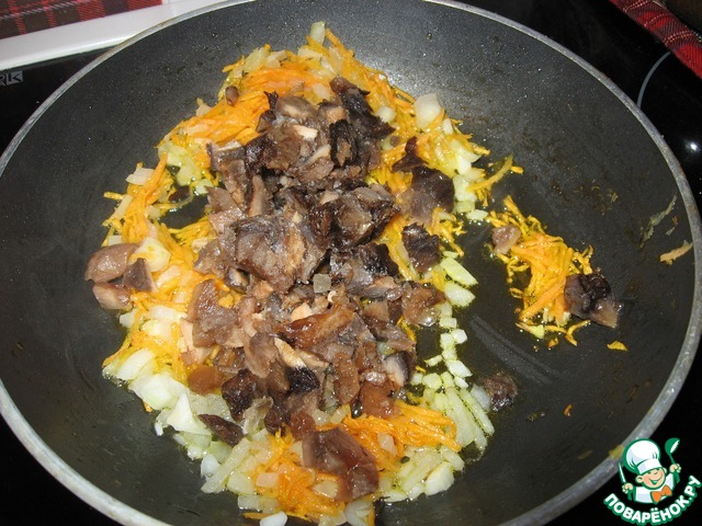 Добавляем нарезанные мелко отварные грибы, перемешиваем
