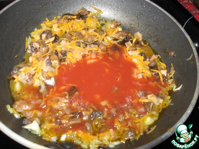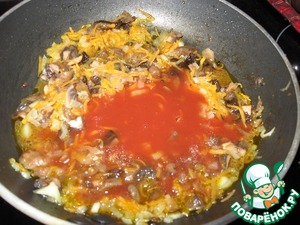 Вливаем разведенную водичкой (от варки капусты) томатную пасту и тушим около 5 минут