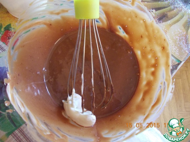Порциями по чуть-чуть добавлять к шоколадной массе и аккуратно перемешивать. До однородности.