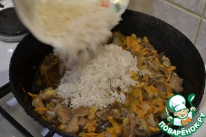 • Доливаем кипяток, что бы жидкость была чуть выше риса, и изредка помешивая, готовим 15 минут на маленьком огне.