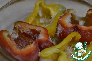 • На дно формы наливаем немножко воды и растительного масла, раскладываем разрезанный вдоль перец