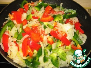 Перец и лук посолить, поперчить, добавить 4 ст. ложки оливкового масла и слегка поджарить в сковородке в течение 5 минут.