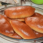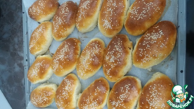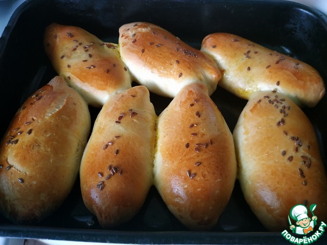Выпекать при 180*С. Время выпечки зависит от размера изделий. Моим пирожкам хватило 20 минут.