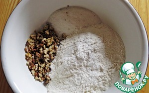 В миске смешать орехи, сахар и просеянную муку. -