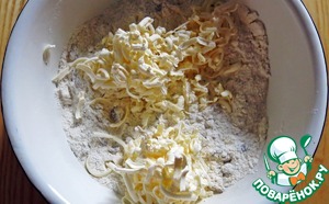 Достать масло из морозилки и натереть на крупной терке. Добавить к мучной смеси и руками перетереть всю массу в крошку.