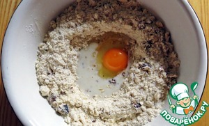 Сделать в крошке "колодец" и влить туда молоко и яйцо.