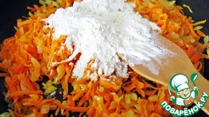 Лук мелко режем, морковь трем на крупной терке. В сковороду кладем 6 ст. л. сливочного масла и обжариваем на нем - лук, до золотистой корочки. Затем добавляем морковь и жарим ещё 2-3 мин. Затем в овощную заправку кладем муку и тщательно все перемешиваем. Обжариваем ещё 1 мин. с мукой.
