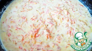 Затем вливаем 1 стакан нашего овощного бульона (от капусты с фасолью), хорошенько перемешиваем и тушим пару минут на медленном огне. Теперь очень важный момент - добавляем молоко. В итоге эта масса у нас должна получиться, как крем-суп. Смотрите по консистенции. У меня ушло почти 2 стакана молока. И по вкусу можно немного подсолить. Тушим около 1 мин. и выключаем огонь.