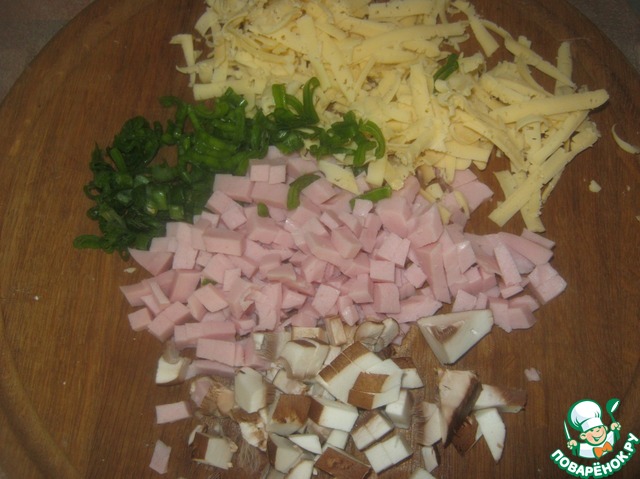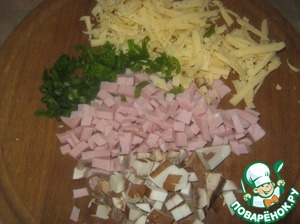 Натираем сыр, мелко режем лук, шампиньон и колбасу