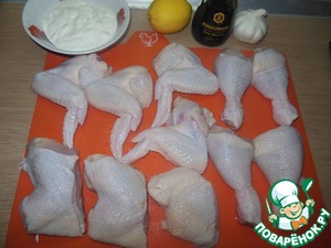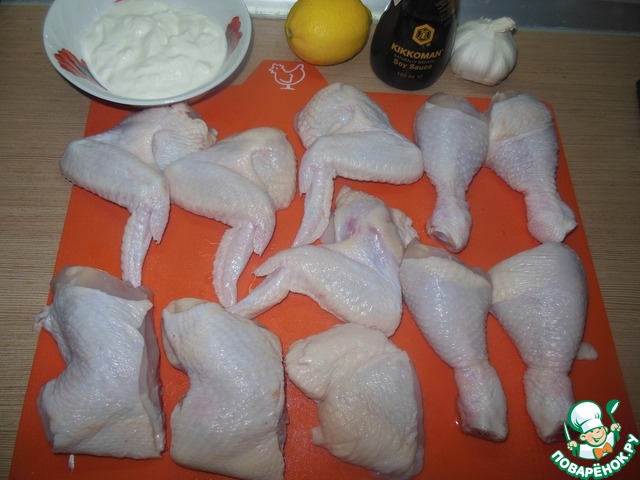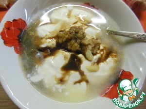 Смешать сметану, сок лимона, соевый соус, чеснок. -