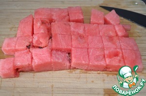 С арбуза срезать корку, удалить все семечки. Арбузную мякоть нарезать небольшими кубиками.