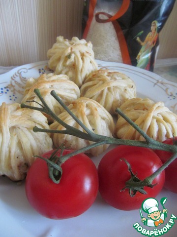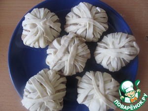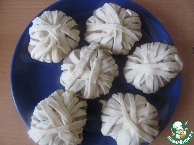 5. Обмотать тестом тефтели, как будто-то нитками клубок. Поставить в горячую духовку на 20-25 минут.