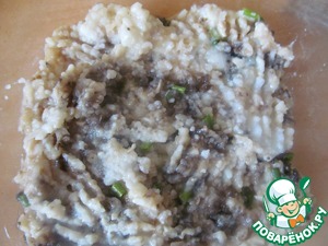 2. Пропустить рис и свежие грибы через мясорубку. Смазать форму растительным маслом, выложить рис с грибами, посолить по вкусу. Это будет первый слой.