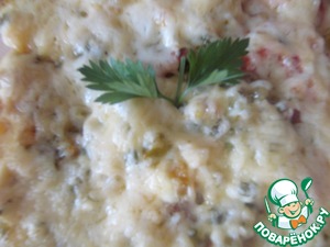 4. Смазать майонезом, поставить в горячую духовку. За 5 минут до окончания посыпать тертым сыром.