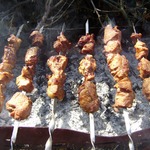 Очистить мясо от маринада и жарить на углях до готовности.