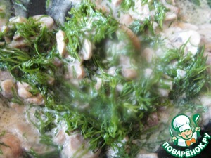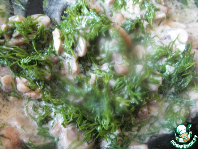 4. Для заливки поджарить грибы с луком, залить сметаной, добавить зелень.