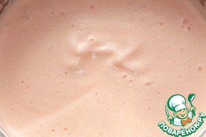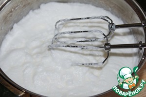 Снять белковую массу с водяной бани и, продолжая взбивать, постепенно ввести желатиновую массу. Я процеживала уже остывшую желатиновую массу сразу при введении в белковую массу. Еще немного взбиваем.