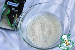 Рис "Жасмин" торговой марки "Мистраль" промыть холодной водой, залить кипятком и приготовить в микроволновой печи 5 минут при мощности 800Вт (максимальная мощность моей микроволновой печи), немного остудить, слить воду. Можно отварить на плите до полуготовности.