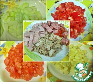 Куриные бедра отварить, остудить и порезать не большими кусочками. Можно сырое бедро отделить от косточки и порезать, но мне с вареным больше нравится. Ветчину, колбасу, лук, перец, помидоры и чеснок порезать не большими кубиками. С помидора можно срезать кожицу для дальнейшего украшения. Для этого у помидора надрезать основание, полностью не срезая, и затем аккуратно ведя нож по кругу, снять кожицу шириной ~1-2см.