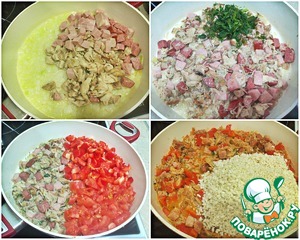 Приступаем к приготовлению блюда. В глубокой сковороде слегка поджарить лук на оливковом масле, добавить бедра куриные, ветчину, колбасу и обжарить все это минуты ~3-4. Затем добавить зелень, перец болгарский, помидор и жарить еще ~7 минут. Затем всыпать рис и перемешать.