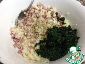Теперь, когда все ингредиенты готовы, смешаем рис, шпинат, сыр и окорок