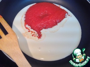 Для соуса: смешаем на сковороде томат и сливки, добавим щепотку мускатного ореха. Соль и перец по-вкусу