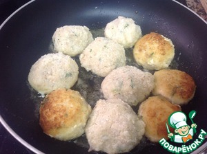 Мокрыми руками слепить тефтельки, обсыпать в панировочных сухарях и обжарить с двух сторон до золотистой корочки