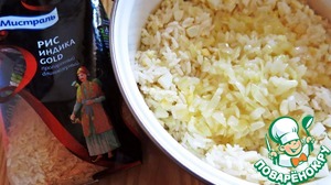 Начнем мы, конечно, с риса. Отмеряем 200 гр. Я использую рис "Индика Gold" от ТМ "Мистраль". Он отлично подходит для любых целей! Заливаем 400 мл. воды, солим по вкусу и варим обычную кашу.