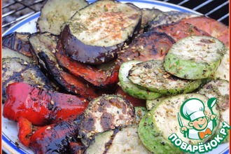 Аккуратно надеваем перцы на шпажки. Заворачиваем в фольгу каждую шпажку с перцем и запекаем в духовке или жарим на решетке над углями до готовности.