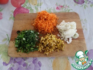 Мелко нарезаем лук, оливки и зелень, трем на терке морковь.