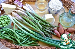 1. Порезать лук-шалот, зеленый лук и чеснок как можно мельче. У стручковой фасоли отрезать корешок и каждую разрезать на 2 или 3 части в зависимости от длинны. У спаржи отломать жесткие концы и разрезать по диагонали на две части. Пармезан натереть на мелкой терке.