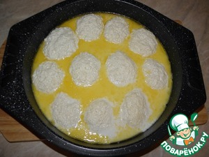 В форму вылить молочную смесь, сверху на нее выложить сырники. можно формировать и выкладывать ложкой, можно руками.