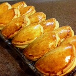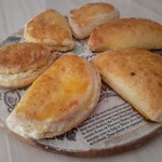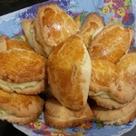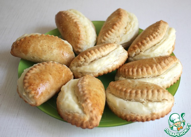 • Тесто достать из холодильника, раскатать его не очень тонко. Примерно о,5 см. Вырезать круги. Выложить начинку на одну сторону кружочка и другой стороной накрыть начинку слегка прижав.