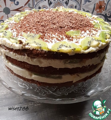 Каждый слой пропитать кремом и выложить кусочки киви. Киви лучше брать не перезрелые, чтобы сохранить кисло-сладкий вкус тортика. Украсить сверху по желанию).