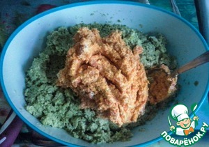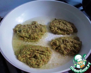 Ставим сковороду на огонь. Можно формировать котлетки и обкатывать в панировочных сухарях. Я просто ложкой выкладывала таки своеобразные оладьи. ( Если боитесь что прилипнет или развалится, то лучше обкатывать в муке или сухарях).