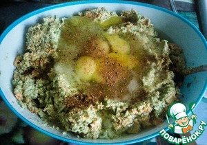 Добавляем яйца, соль, смесь перцев и 5-6 ст. л муки. Перемешиваем.