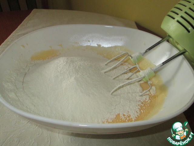Затем добавить муку с разрыхлителем и хорошо все размешать.