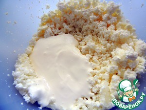 Творог растереть с сахаром, добавить 3 ст. л. сметаны.