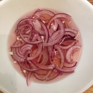 Режем лук на очень тонкие полукольца, добавляем уксус и доливаем воды, чтобы покрыл лук, и оставляем минут на 10.