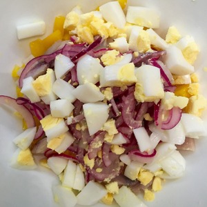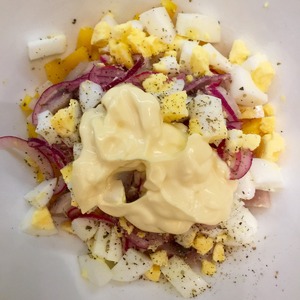 Отжимаем лук, кладем туда же. Отварные яйца тоже режем кубиками и бросаем туда же в салатницу.